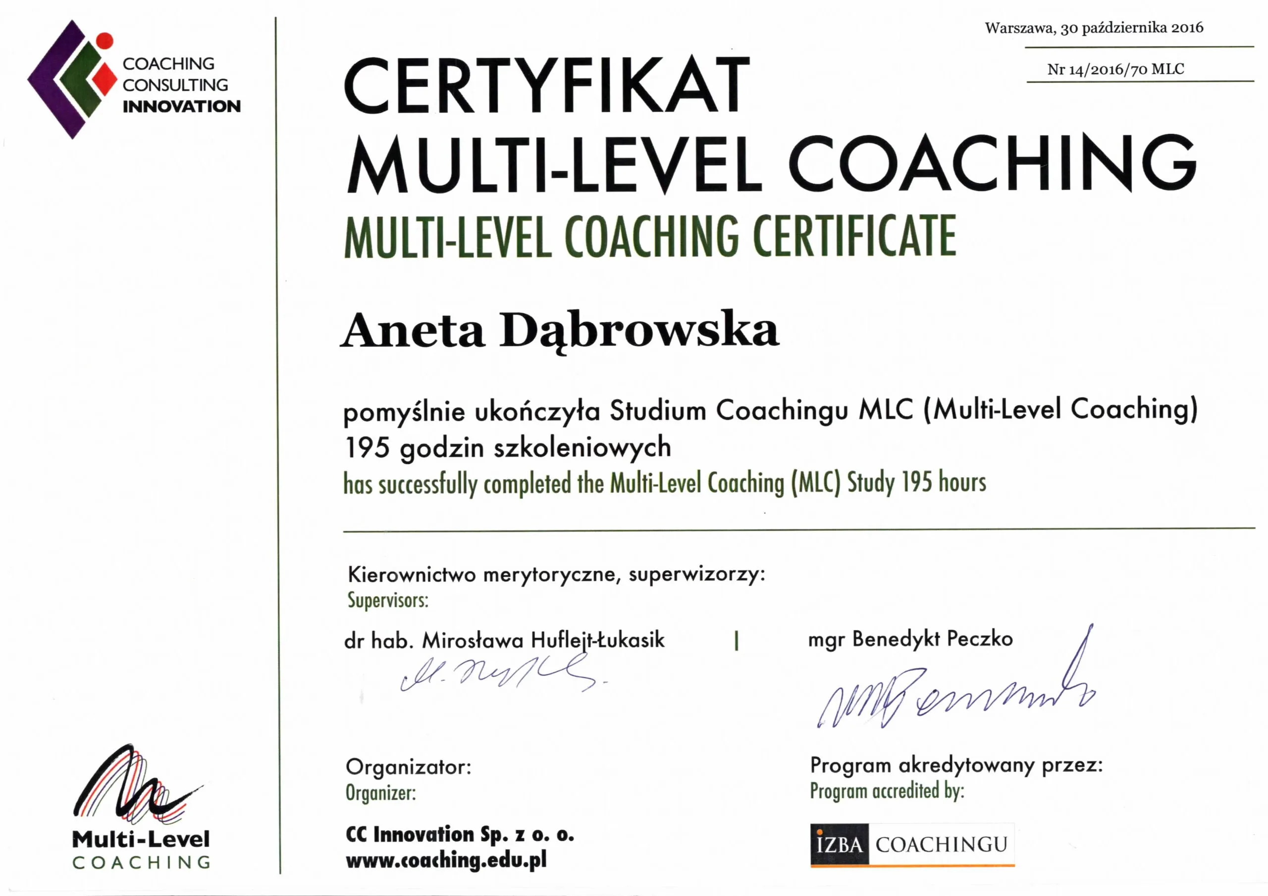 Posiadam Certyfikat Coacha MLC, potwierdzający ukończenie akredytowanej Szkoły Coachingu i Pracy z Grupami MLC.